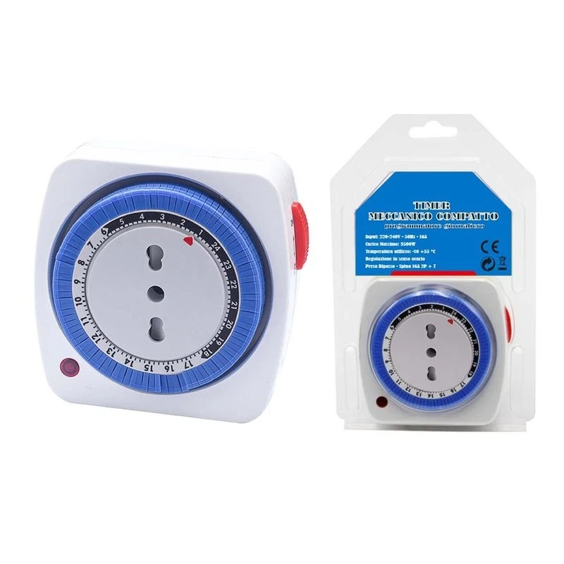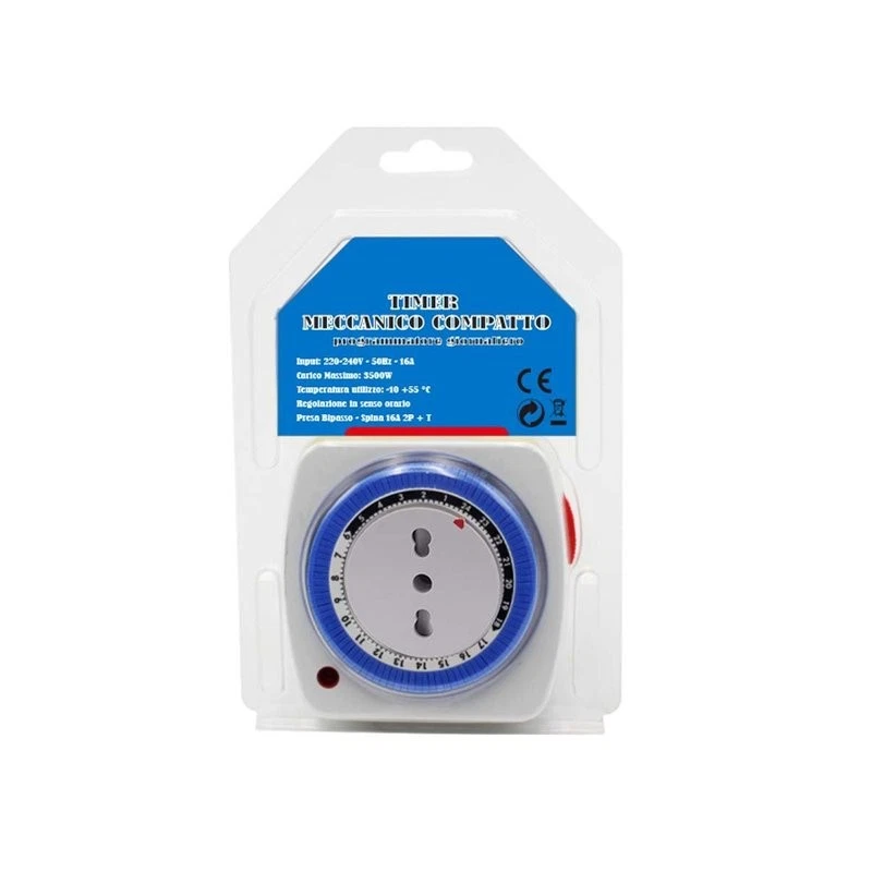 Protezione IP20 – 230V/50Hz/16A, max 3680W Regolazione: minimo 15 minuti, max 24h Spina Italiana 16A 2P+T, presa bipasso