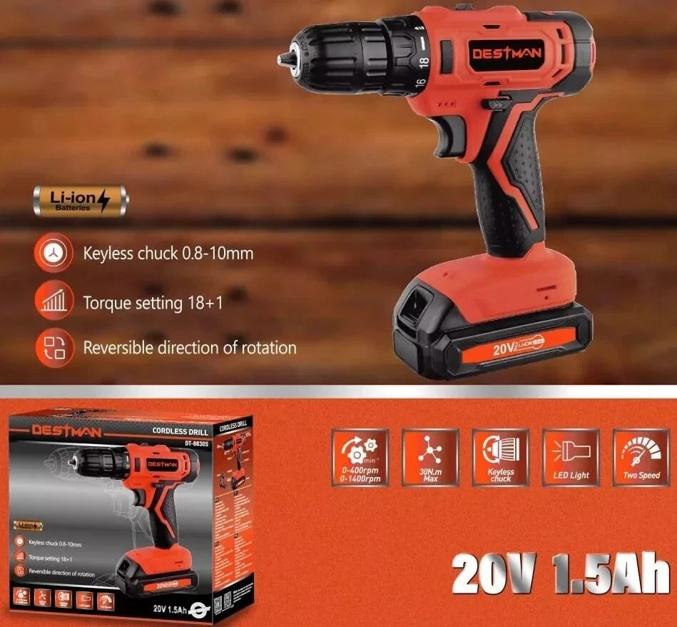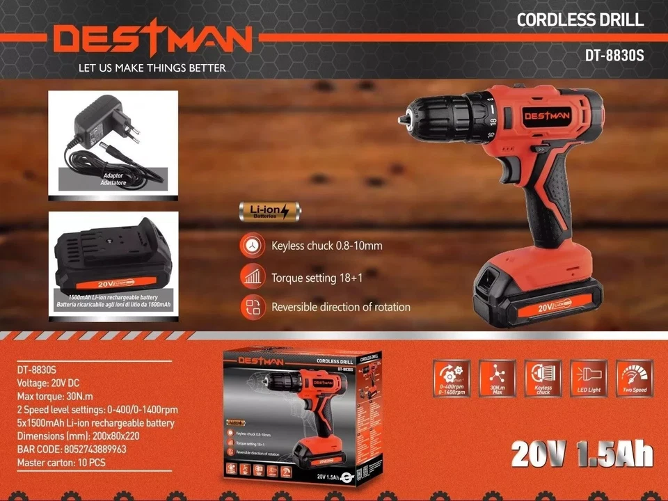 TRAPANO AVVITATORE CON BATTERIA INCLUSA 5.5 MAH 20V CON LED 1400 RPM DT-8830S