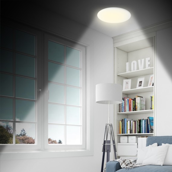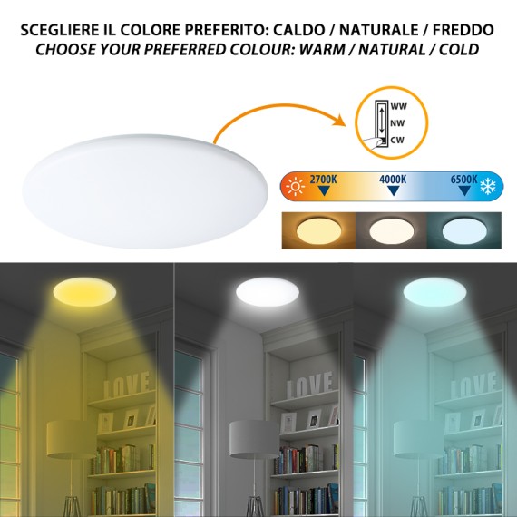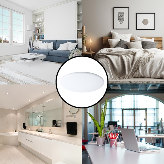 Design elegante: la lampada rotonda 24W e 2000 lumen propone un design contemporaneo e extra sottile: soli 55mm di spessore; è facile da montare sia a parete che a soffitto; lo speciale diffusore rende l’illuminazione uniforme e morbida; IP54: conviene sia per interni che esterni ed è perfettamente utilizzabile in bagno. Scelta del colore della luce: con la tecnologia CCT potete scegliere in qualsiasi momento il colore di luce che preferite! Grazie al semplice interruttore integrato potrete (senza aprire la lampada) scegliere tra: luce calda (3000K), luce naturale (4000K) o 6500K (luce fredda). Non dovrete più scegliere tra comfort e funzionalità! Impermeabile: la lampada è progettata per uso sia interno che esterno grazie all’alto grado di protezione IP54, a prova di acqua e polveri; ideale per bagno, balcone, soggiorno, corridoio, officina, garage, giardino ecc. Gli innovativi connettori vi consentiranno di collegare la lampada in maniera semplice, veloce e duraturo. La staffa di montaggio a soffitto vi aiuterà a realizzare un montaggio semplice e veloce. Qualità e affidabilità: la qualità della plafoniera rotonda è comprovata da certificarti TUV; la lampada non è dimmerabile e ha una durata di vita di 30 000 ore.